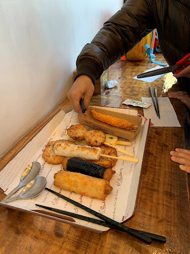 午餐就近享用釜山名產之一的魚糕,其實就是各種魚漿製品,甜不辣那類的東西。不過這可不是路邊攤或是傳統市場喔,古來思把魚糕餐廳提升到魚糕界的新高度,產品都陳列在明亮寬敞、而且有風味介紹和推薦指數的檯面上。挑選完畢後可以外帶可以內用,而且絕對不是紅白背心袋盛裝XD